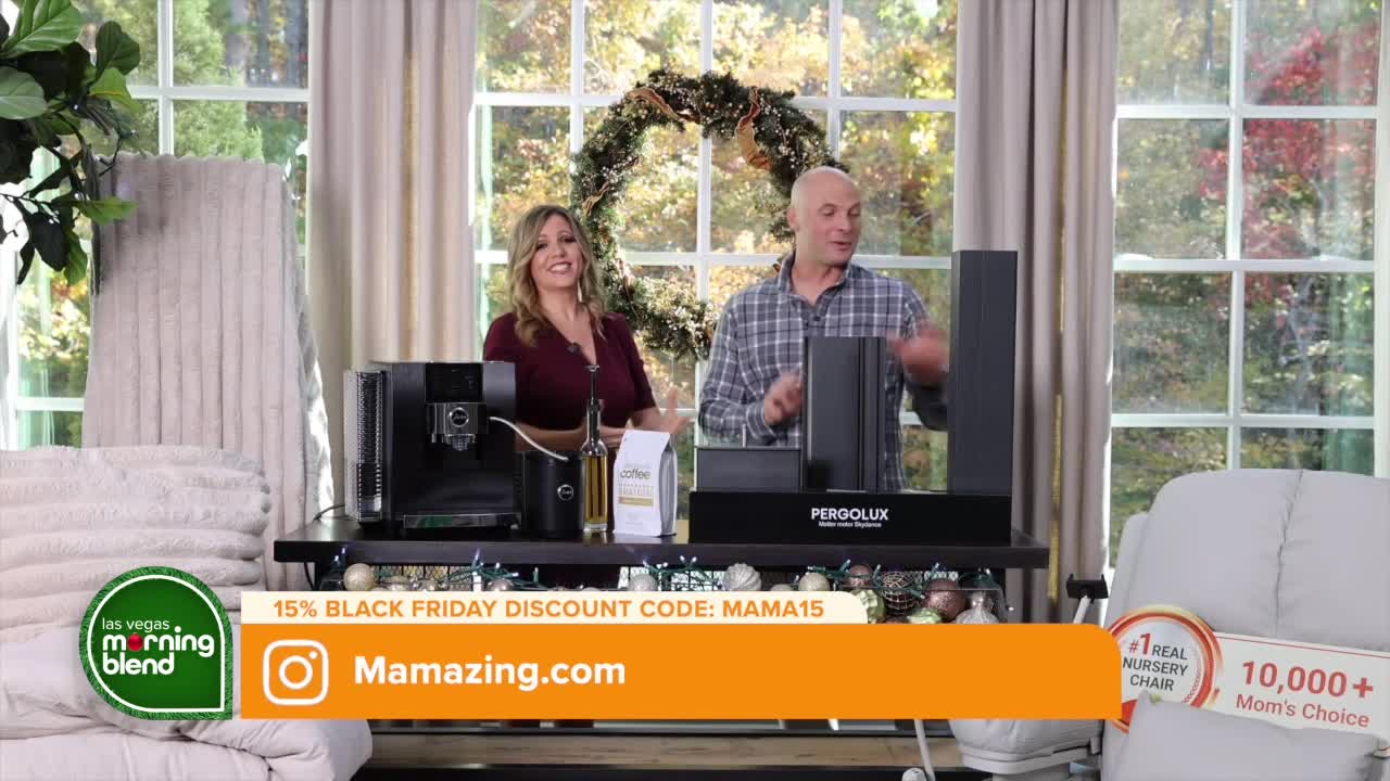 Home Improvement Experts, Kathryn Emery and Chip Wade visited to show off Bedsure 2-in-1 and Bedsure Organic Sheets on Amazon use code BEDSURE2IN1 only valid Black Friday Weekend; Mamazing Lullapod Adjustable Nursery Recliner use code Mama15 for 15% off Black Friday; JURA Z10 For Hot, Cold Brew or Sweet Foam Coffee Specialties; and Pergolux stylish pergolas for the whole family to relax, PERGOLUX Skydance: Black Friday Savings Code: CHIP250!