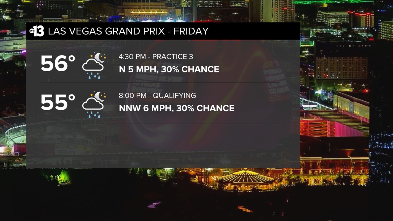 Saturday serves up a 20% chance for a passing shower, so we'll keep an eye on the radar. Temperatures near 50° early in the morning will reach the low 60s in the afternoon, then dip to the mid-and-upper 50s in the evening. While a stray shower can't be ruled out for the F1 race, the chance drops from 20% at 8pm to 10% after 9pm.