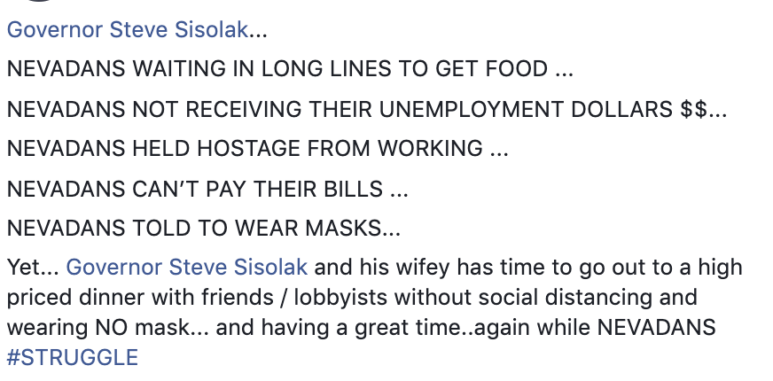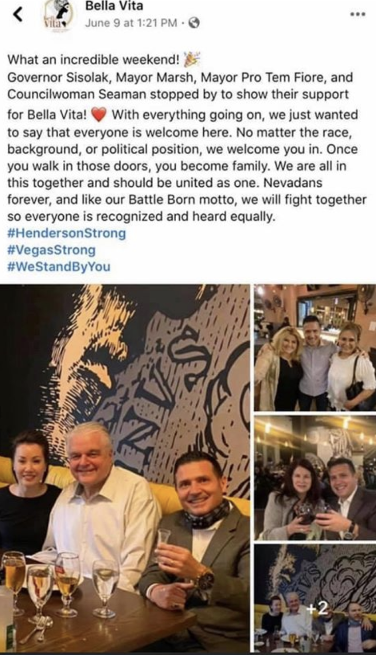 While supporting a local Southern Nevada business and eating a dinner with the First Lady, both the Governor and the First Lady removed their face coverings in order to eat their meals after they’d been served. He was approached and agreed to take a quick photo with the management of the restaurant. The governor recognizes he should have put his face covering back on and separated himself by six feet. He understands we are all adjusting to these practices under our new normal and he takes his responsibility seriously to model the behavior he expects of the residents of this State to replicate. He can assure Nevadans this will not occur again.
