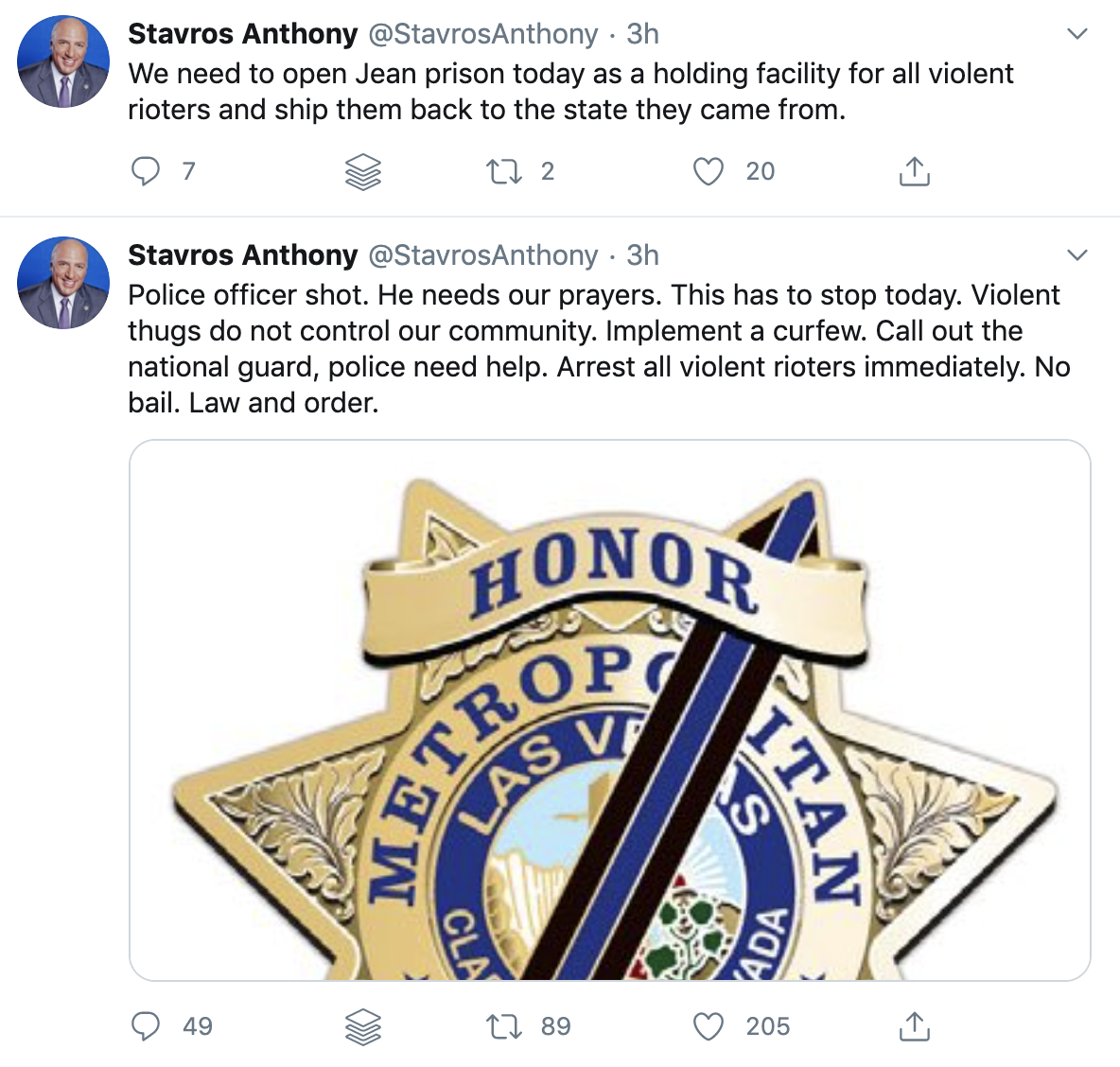 Stavros, who is a also a retired police captain, is also demanding that the prison in Jean be used as a holding facility for all violent rioters. Additionally, he says the rioters need to be shipped back to the “state they came from."