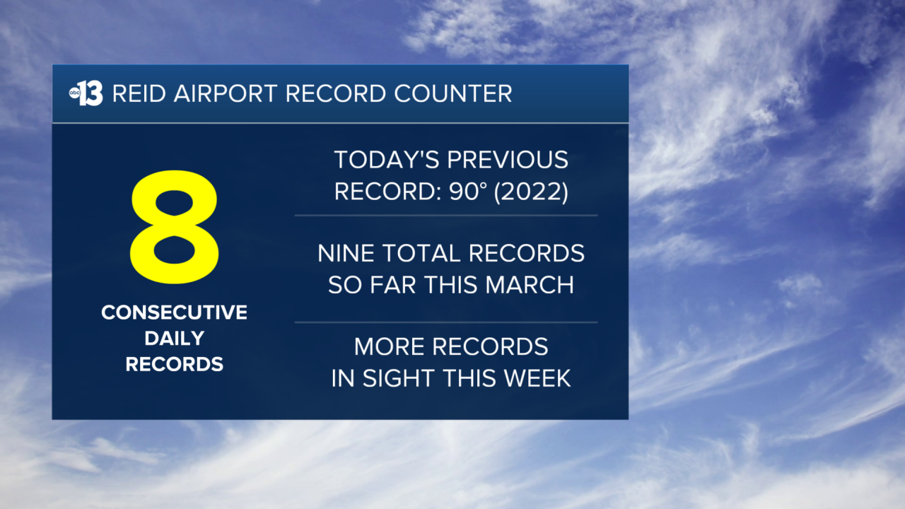 LAS VEGAS (KTNV) — Wednesday was the eighth straight day setting a daily high temperature record at Harry Reid International Airport — we reached 98° today, which is also the hottest temperature ever recorded in March in Las Vegas!