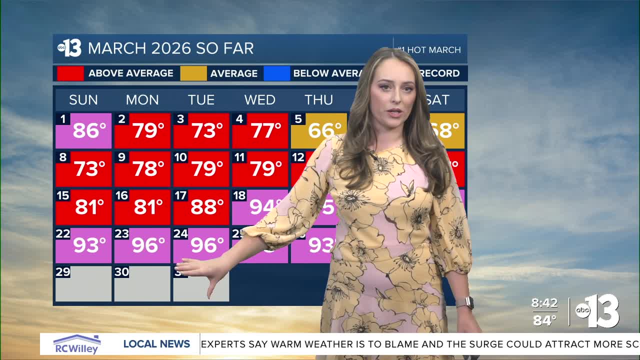 Temperatures are still on the warm side Sunday with highs in the mid-90s in the Las Vegas valley. We're likely to break another daily high temperature record tomorrow, which was previous 89 degrees set in 2015. As it stands now, we're going to clock in with the #1 warmest March on record in Las Vegas due to this heat streak.