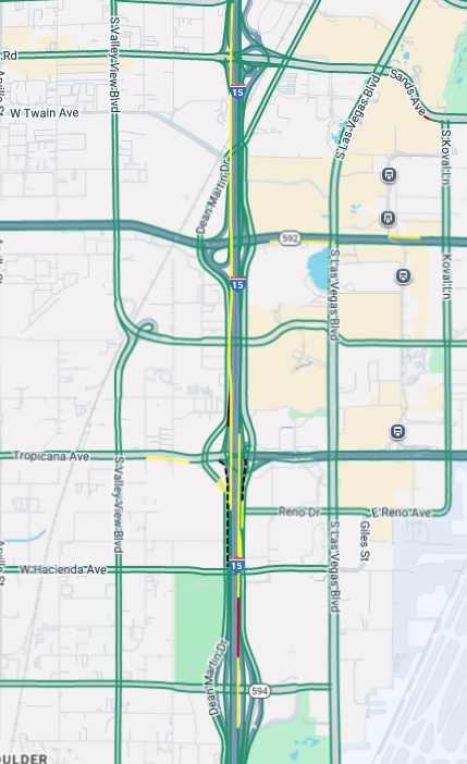 The ongoing roadwork has created major traffic backups along what many consider a gateway to the Las Vegas Strip, as shown by this screenshot of NDOT's traffic at the time of this article's publication.