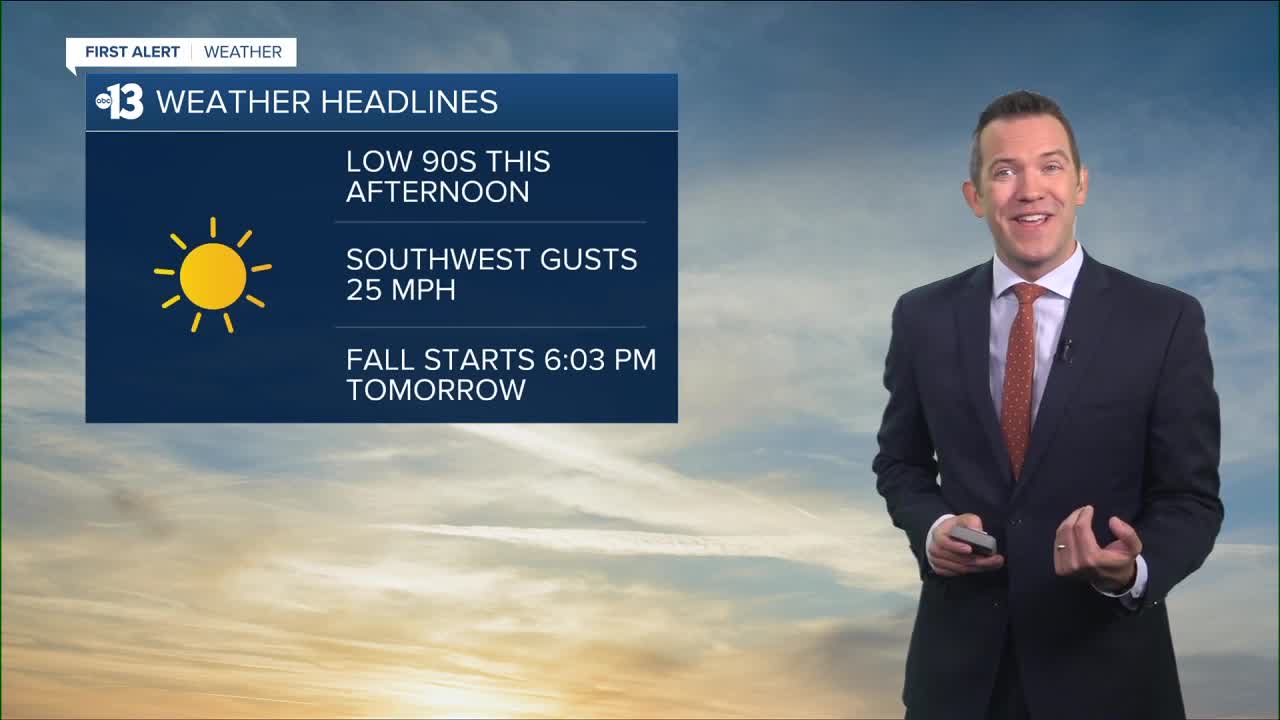 LAS VEGAS — It's a mainly clear early morning in the low 70s around the Las Vegas valley. Expect 80s by 10 a.m. and low 90s this afternoon. Southwest winds pick up to 25 mph by midday and linger into the early evening. This evening dips from the 80s into the 70s by 9 p.m. as breezes fizzle and the sky stays clear. Lows late tonight and early Thursday morning will settle into the mid and upper 60s. Highs hover in the low 90s tomorrow as fall officially begins at 6:03 p.m. with plenty of sunshine and noticeably calmer conditions. Low humidity keeps storm chances away from Las Vegas this week, although scattered storms with heavy rain are possible today from Arizona through Utah. Mid 90s this weekend will give way to upper 90s early next week as a ridge of high pressure keeps the Southwest United States in a dry, warm pattern as we round out the month of September.