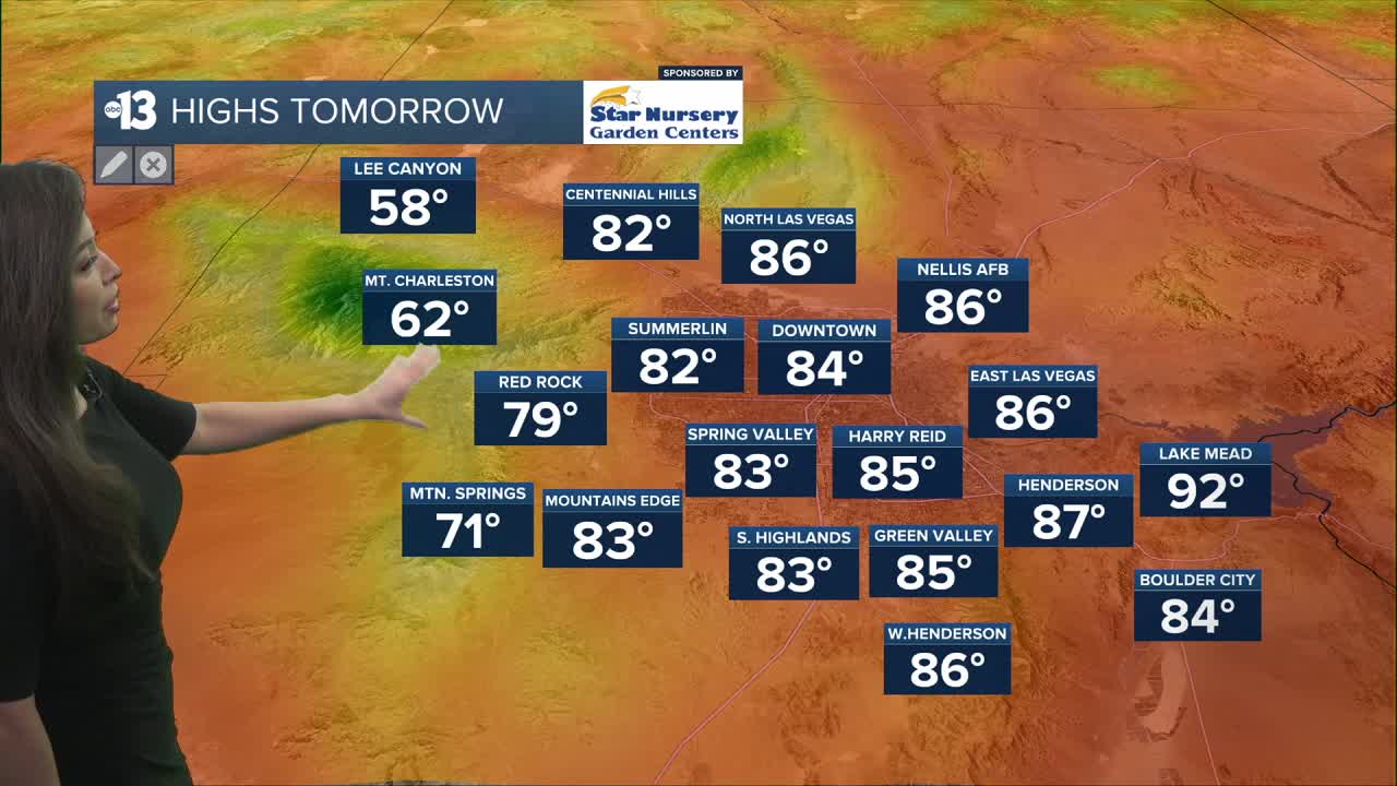 Clear and cool with lows dropping into the 50s and 60s. High pressure will keep our weather sunny and dry with high temps running a few degrees above average through midweek. Rain chances return starting on Thursday as some leftover moisture from the remnants of Hurricane Priscilla moves into Southern Nevada. The chance continues through Saturday. Drier by Sunday. Highs in the mid to upper 80s through Thursday and cooling off through the weekend. Overnight lows will be in the 50s and 60s this week.