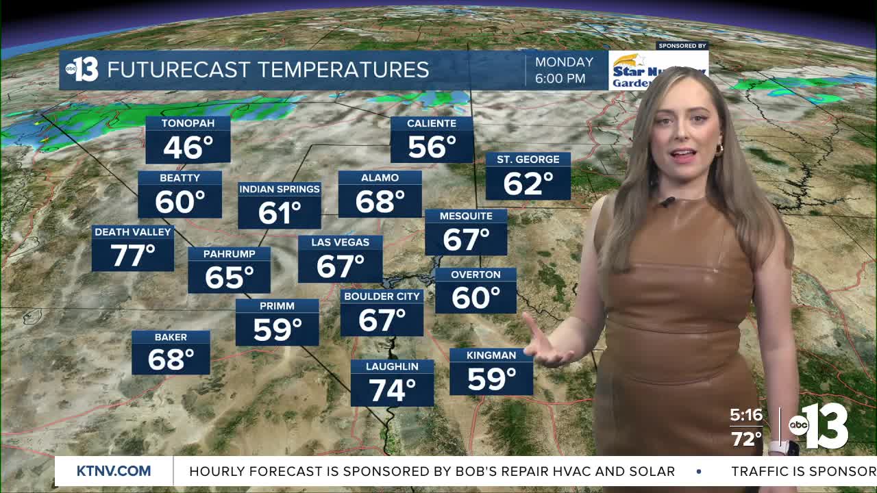 We are tracking the influence of several rounds of low-pressure activity spreading into the Pacific Southwest this week. We'll see increasing cloud cover starting Monday, winds picking up Tuesday, and Wednesday evening we're tracking an uptick of precipitation chances. Ultimately, the overall influence of this week's system will be low in Southern Nevada, aside from temperatures dropping back to the upper 60s by mid-week.