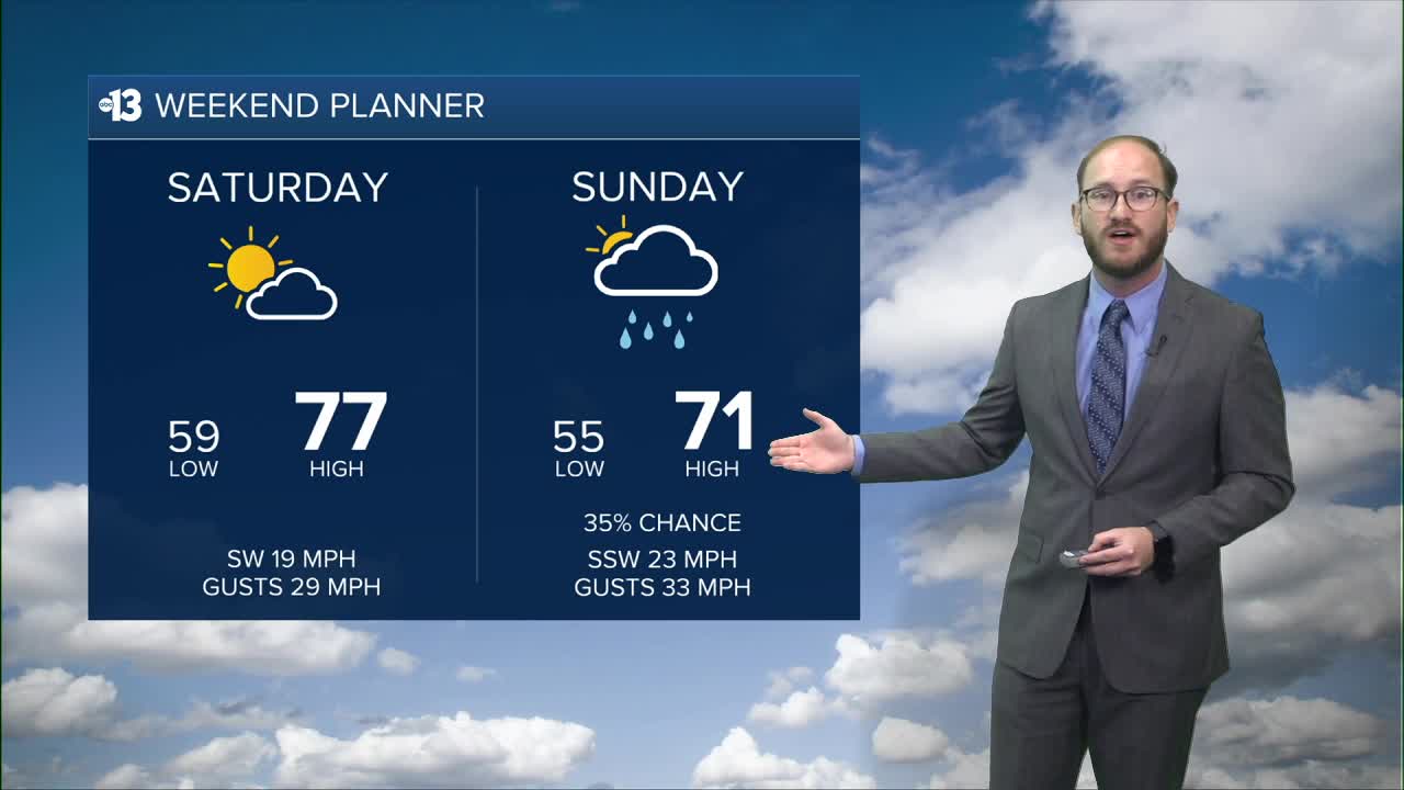 SUNDAY: Windy and cool with RAIN CHANCES! Gusts could exceed 30 mph, with temperatures in the low 70s — rain chances at 35%, but accumulations and impacts expected to be minimal