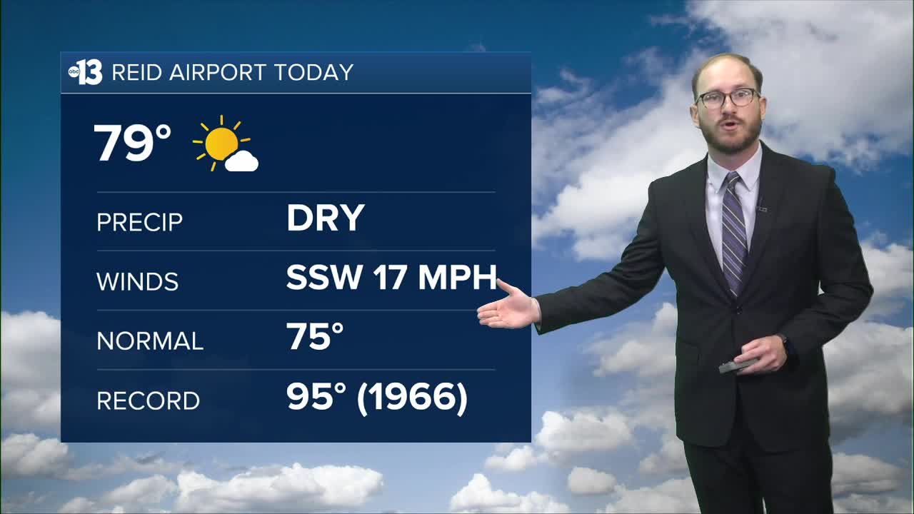 TODAY: Breezy winds with gusts upwards of 25 mph, daytime highs in the upper 70s