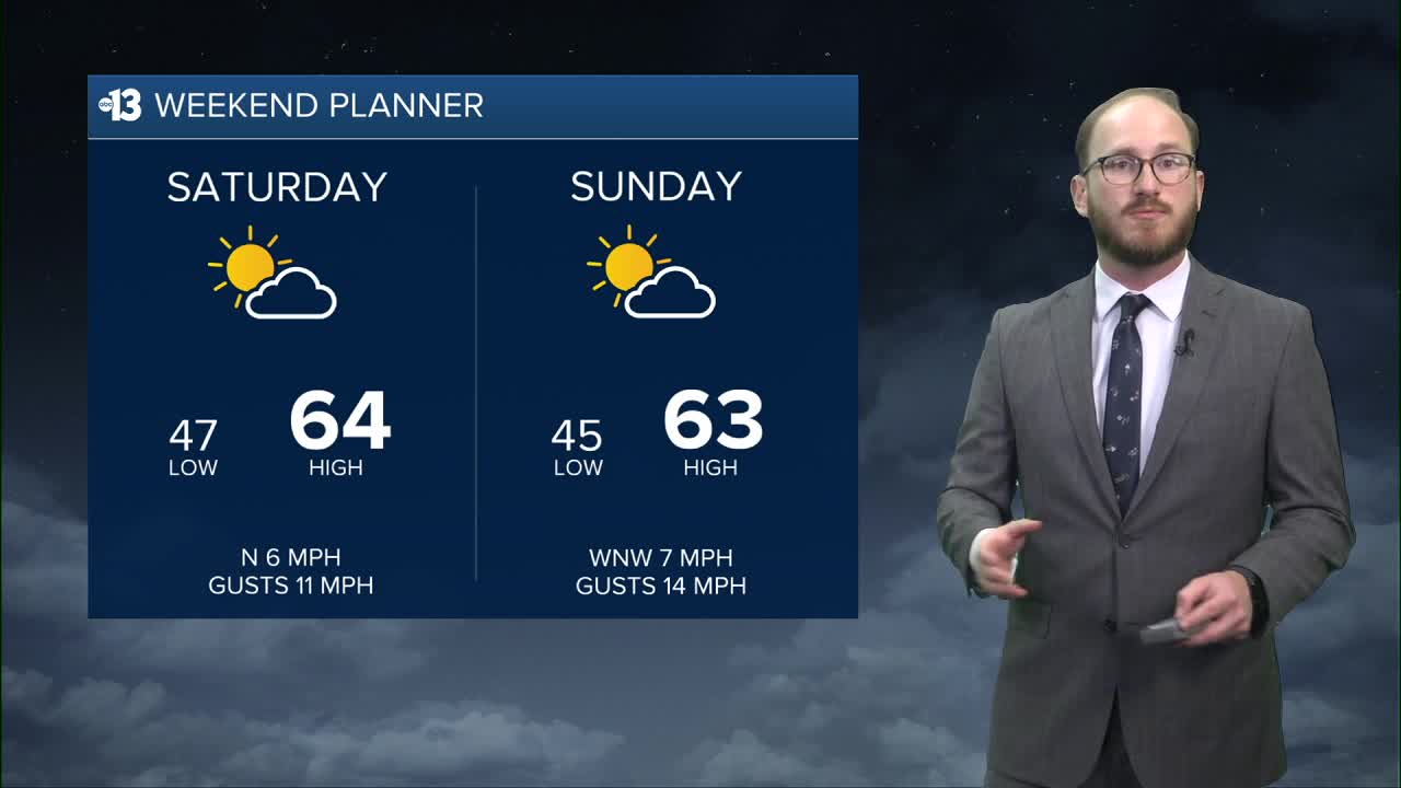 THIS WEEKEND: Daytime highs in the low to mid 60s with decent amounts of sunshine and calm winds, staying dry