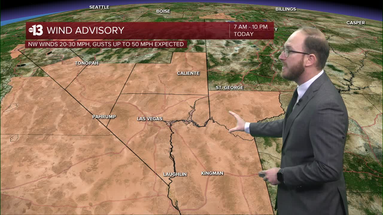 The National Weather Service has a Wind Advisory in place for Clark, Lincoln and Southern Nye counties until 10 o'clock tonight, for sustained winds from the northwest at 20-30 mph, with gusts upwards of 50 mph possible for our forecast area.