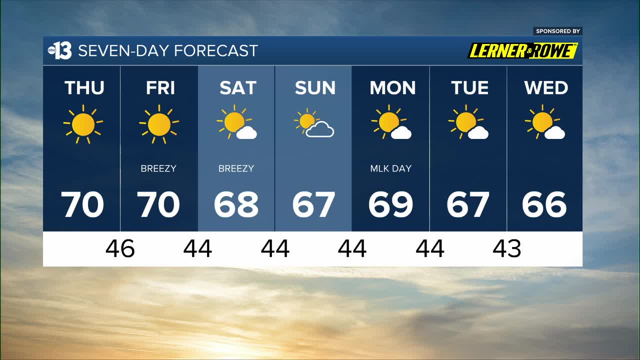 Dr. Martin Luther King, Jr. Day remains mild and dry; the parade downtown will be partly cloudy with readings already near 60° at 10 a.m., when our coverage begins on Channel 13.