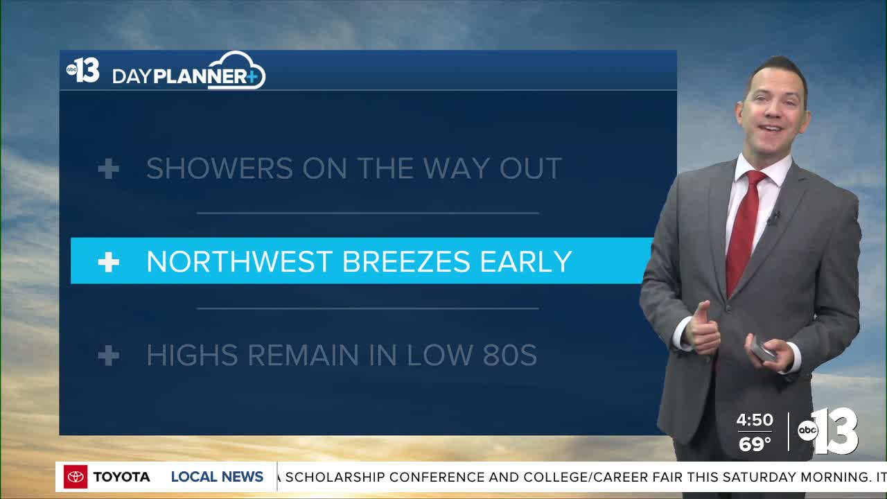 Friday looks sunny with another cool start near 60° and a mild afternoon in the low 80s.