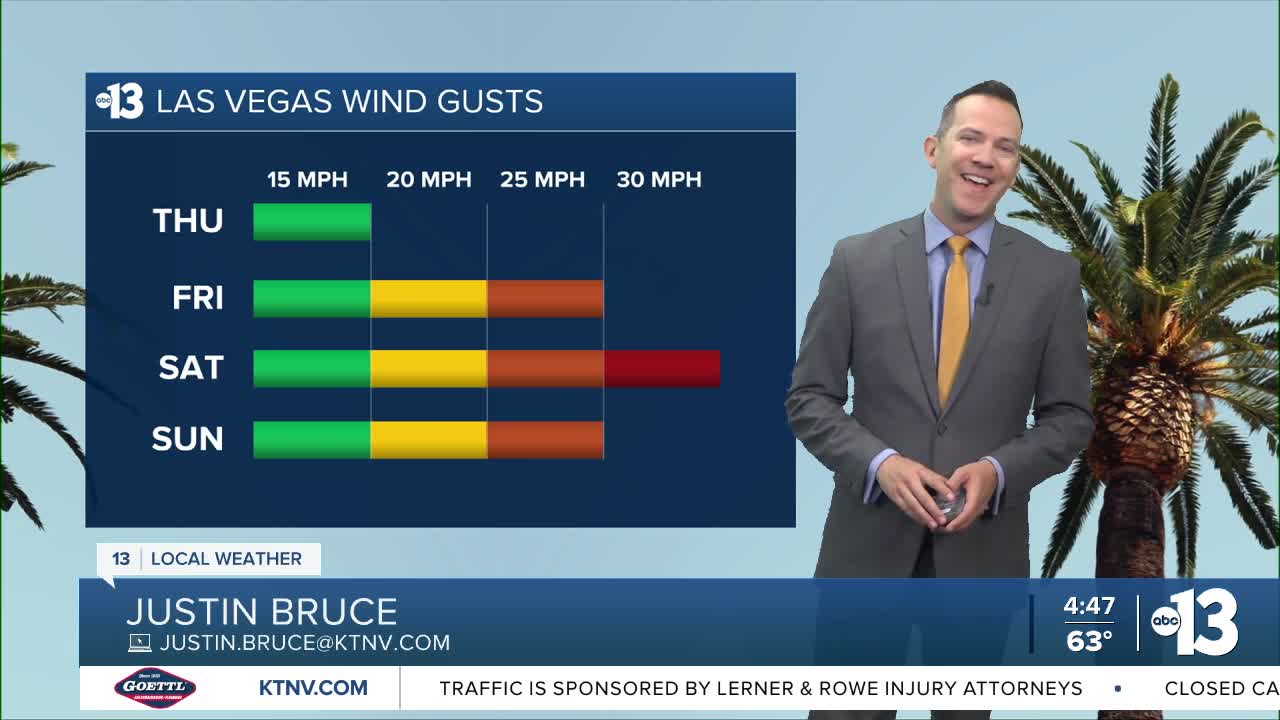 A blustery weekend is ahead: Saturday sees 30 mph gusts and Sunday sees 25 mph gusts. The breezes are expected from start to finish each day. Partly-to-mostly cloudy conditions on Saturday bring a 20% shower chance and limit highs to the mid 70s. Sunday is partly cloudy with 50s at daybreak and in the low 70s in the afternoon.