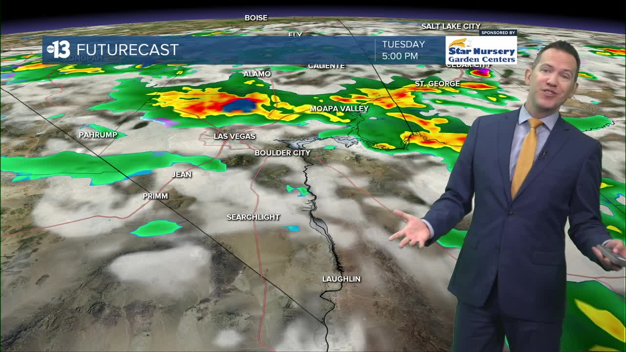 Tuesday brings the best rain chance of the week (80%) and totals will approach 0.25" in Las Vegas. Highs will be limited to the upper 50s.