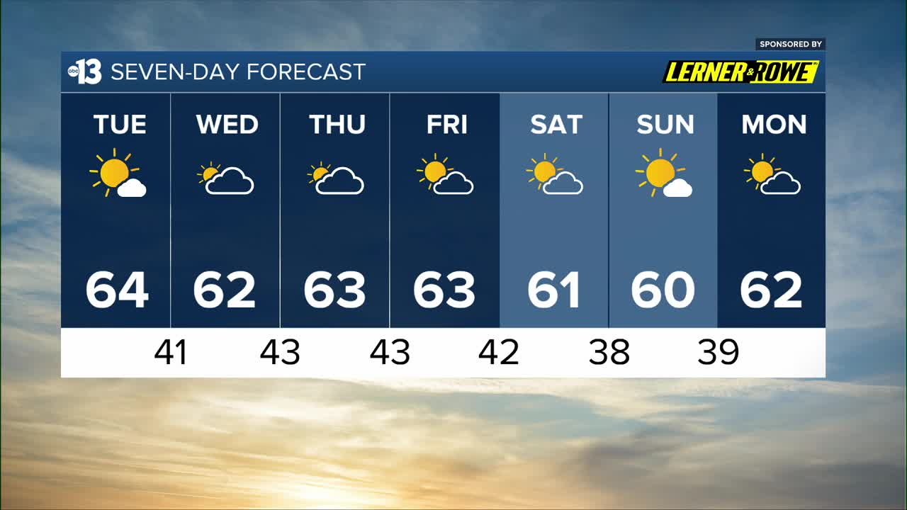 Mostly sunny weather returns Friday through the weekend, but highs remain limited to the low 60s, which is typical for late January. Saturday and Sunday nights will dip to the upper 30s all across the valley.
