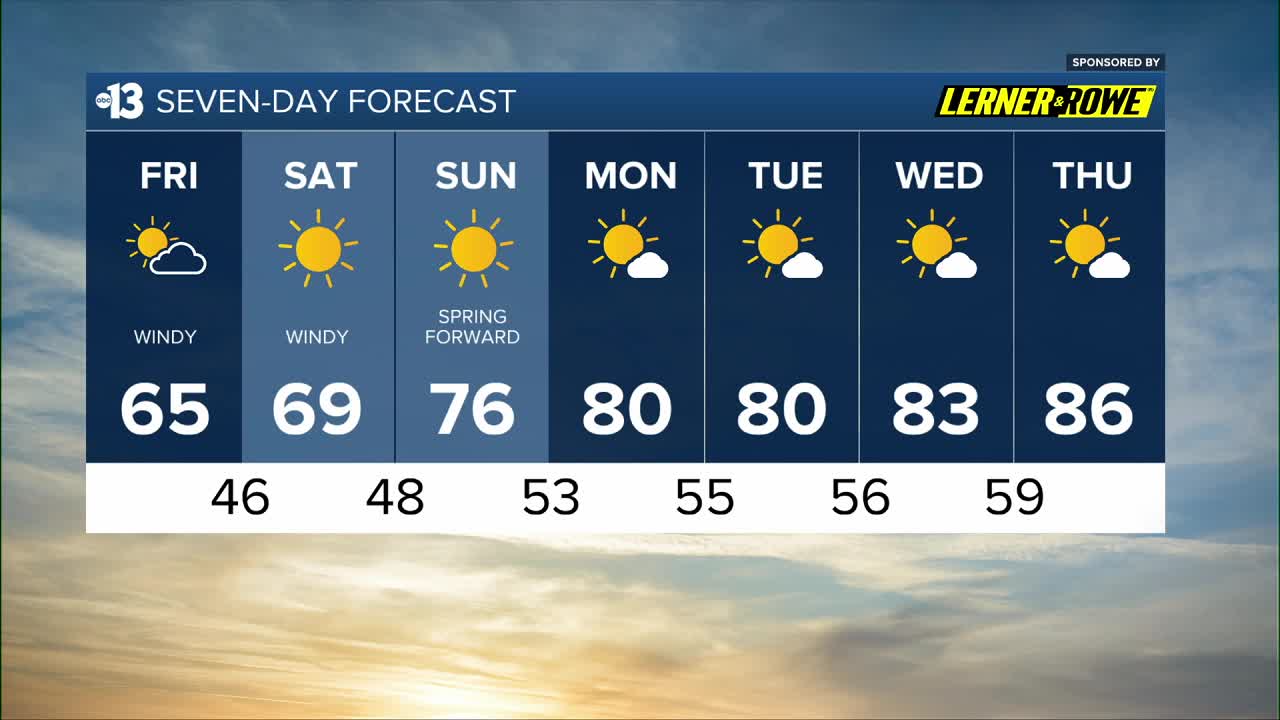 We spring forward Saturday night, setting the clocks ahead one hour to return to daylight saving time. Sunrise and sunset shift to near 7 a.m. and 6:45 p.m. Sunday.