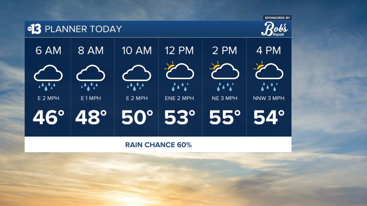 AFTERNOON: Rain chance climbs to 60% with a mostly cloudy sky and temperatures only in the mid 50s.
