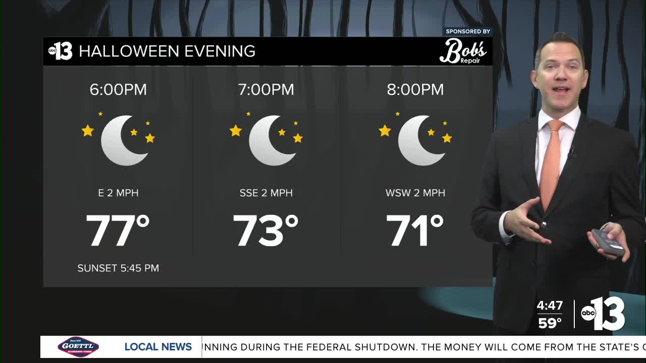 EVENING: Trick-or-treat temperatures cooling to the upper 70s after sunset at 5:45 p.m.