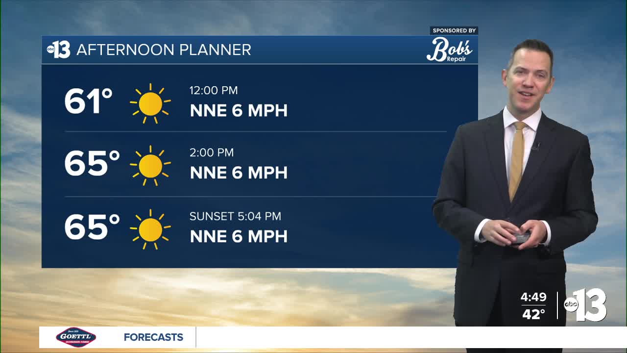 Friday brings mostly sunny conditions, a few 5-15 mph breezes, and a climb from the 40s early to the upper 60s in the afternoon.