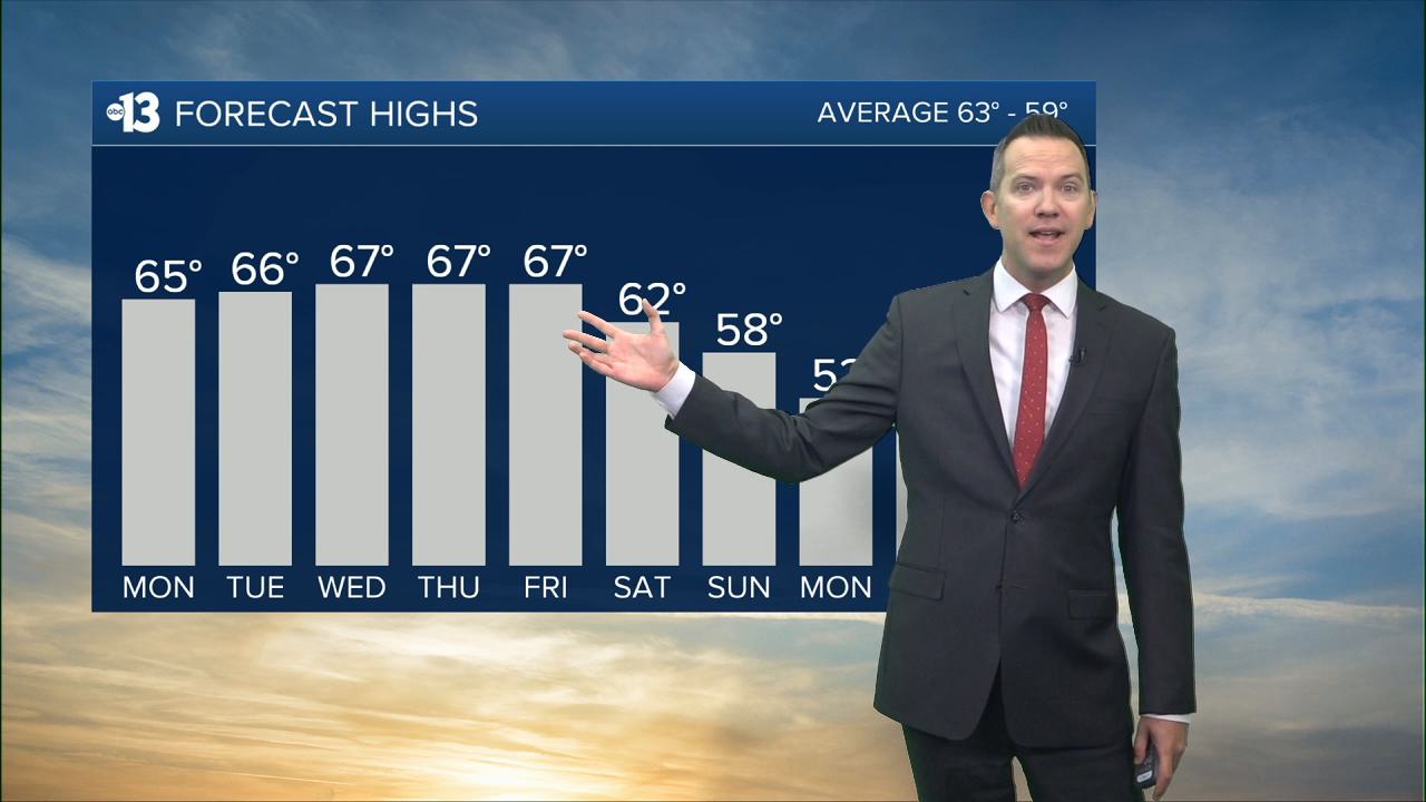 The weekend brings thicker clouds and a drop in temperatures. Look for 62° Saturday as north breezes develop at 5-15 mph. Sunday only sees upper 50s in the afternoon as 30% rain chances develop and north winds at 10-20 mph add to the chill.