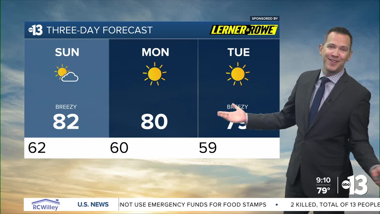 SUNDAY AFTERNOON: Highs in the low 80s with a mostly sunny sky and returning 10-20 mph breezes.