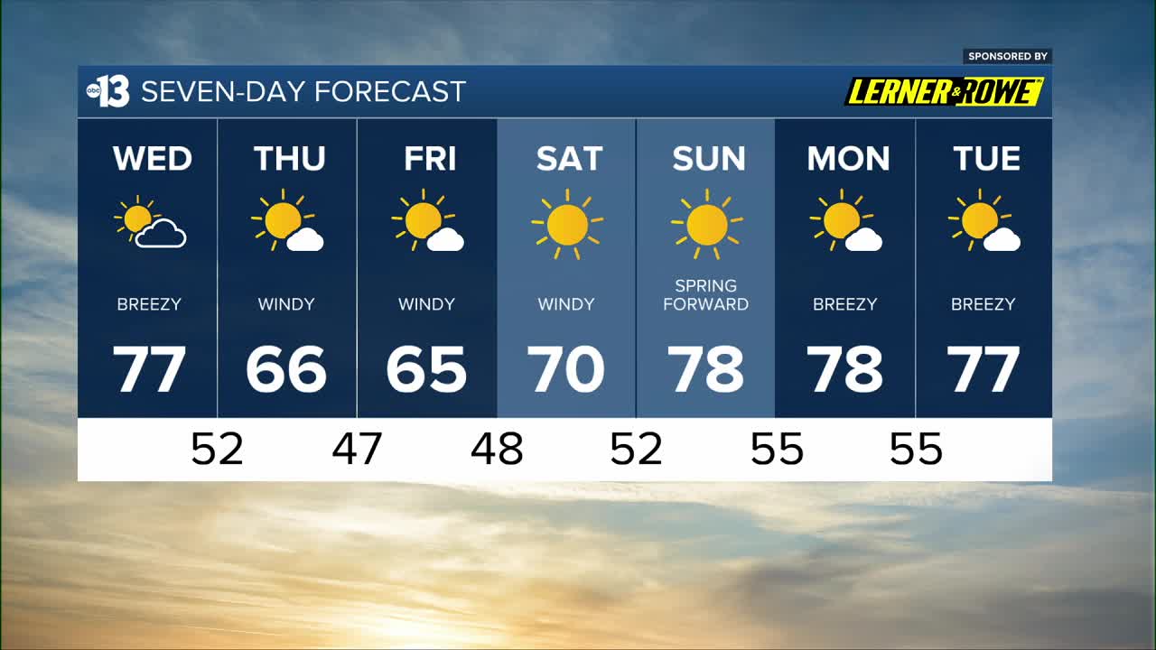 Friday remains blustery (north winds 15-25 mph) with mostly sunny conditions and highs in the mid 60s. Lows Friday night dip back to the upper 40s as breezes continue.