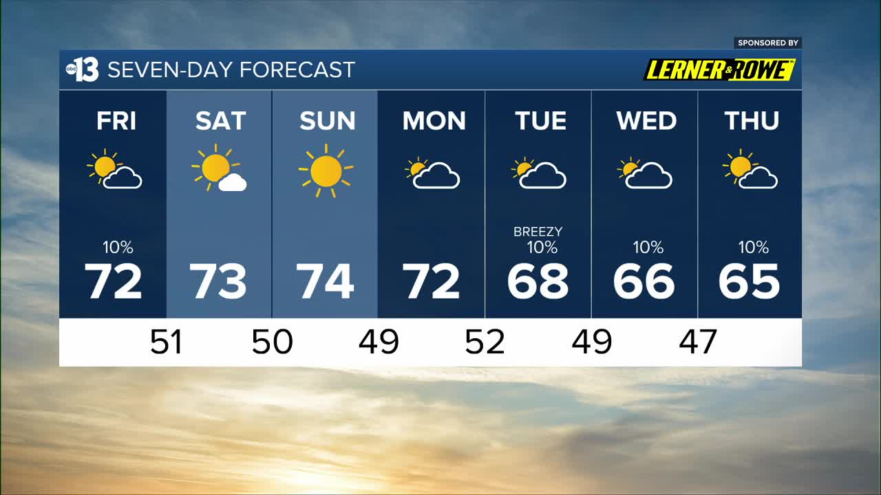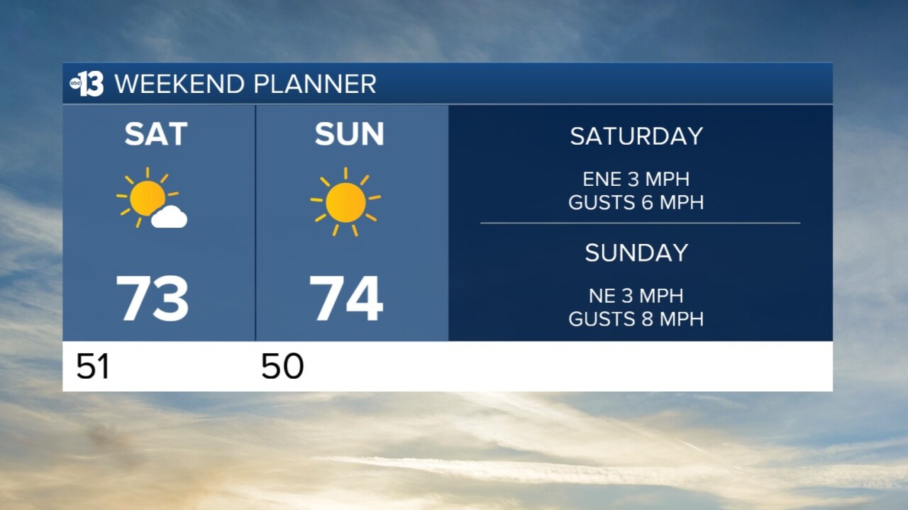 Both weekend days look fantastic, weather-wise. Highs rise to the low 70s with a mostly sunny sky and winds will be light, at only 5-10 mph.