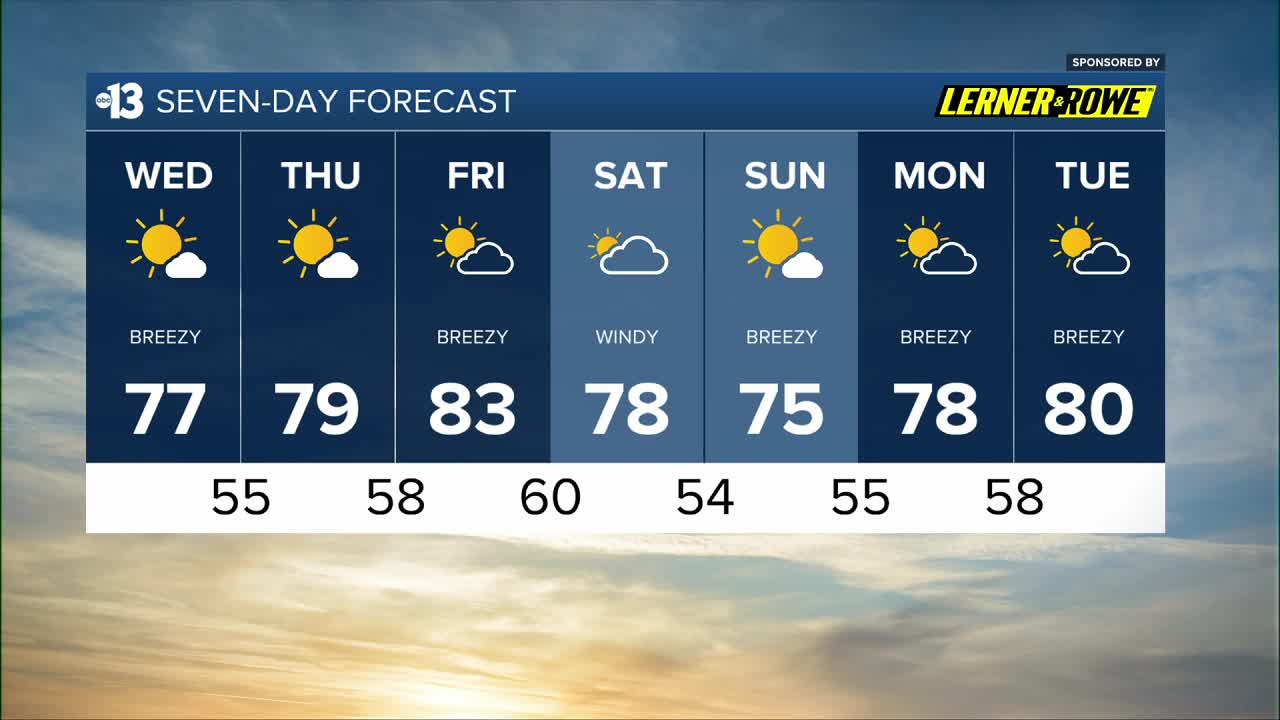 Sunday is mostly sunny with highs in the mid 70s after a chilly morning in the 50s. We'll see lingering (but manageable) breezes at 15-25 mph.