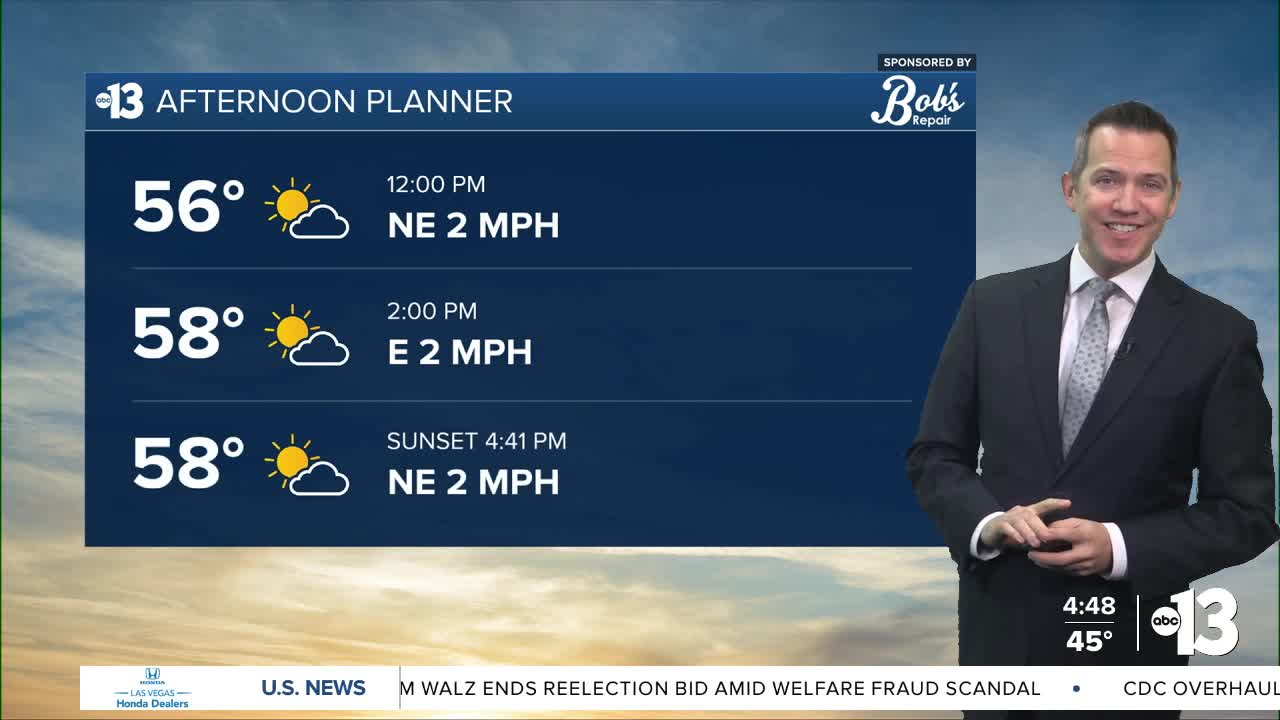While today is dry, we'll watch a few isolated showers pass across southern Clark County on Wednesday, in places like Laughlin, otherwise we expect a partly cloudy sky and highs in the upper 50s.