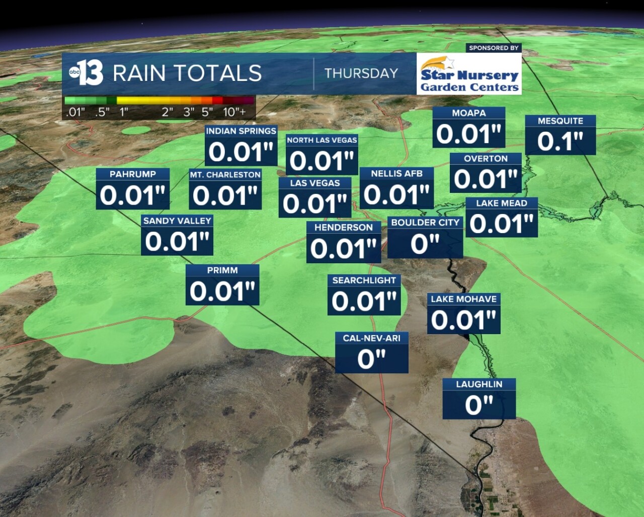 A small chance of rain reaches Las Vegas late Wednesday night through Thursday morning, and afternoon highs only rebound to the mid 50s as northwest winds blow at 10-20 mph.