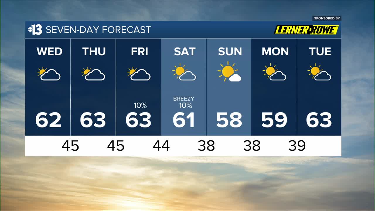 Mostly cloudy conditions continue tomorrow, and Friday, keeping highs in the low 60s the rest of the week.