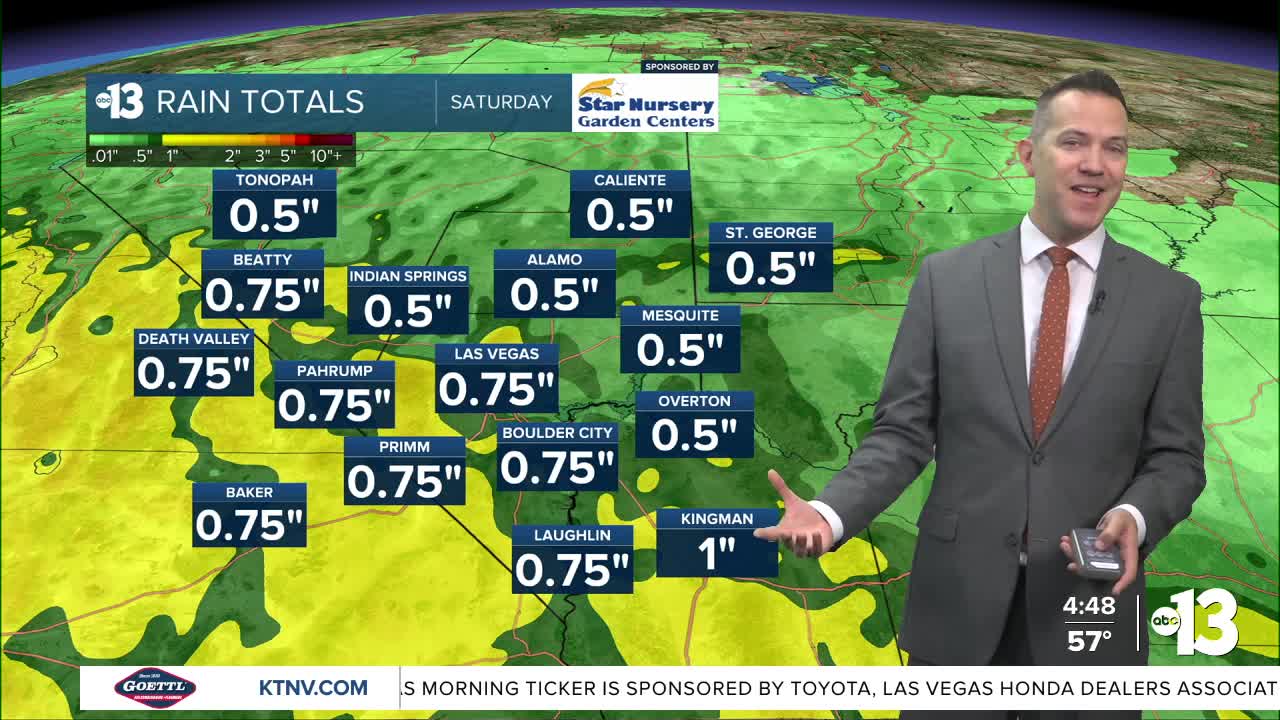 Rain is possible at any point Saturday, and the chance in Las Vegas is very high (90%) with possible totals around 0.50" as a round of heavier showers is expected in the afternoon or evening. Highs Saturday are limited to the mid 60s alongside a mostly cloudy sky.