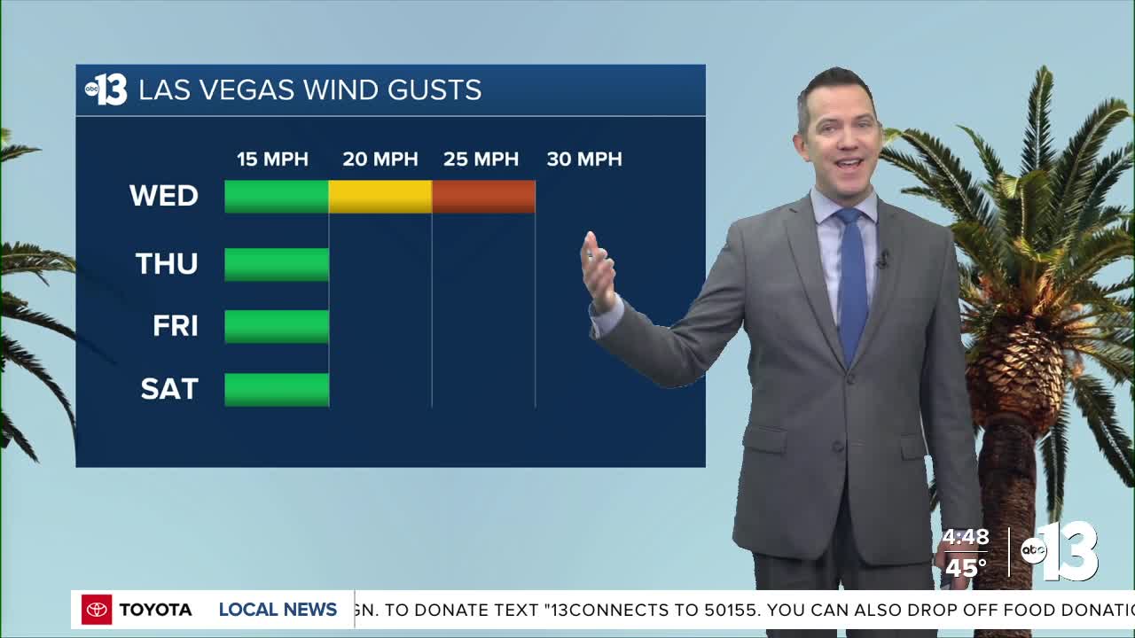 AFTERNOON: Midday gusts of 30 mph in the north valley, 25 mph near The Strip, and 20 mph in the south valley. Sunny with highs in the upper 50s.