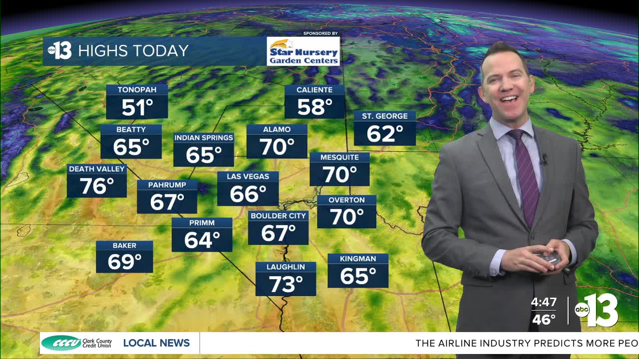 The weekend brings thicker clouds and a drop in temperatures. Look for 61° Saturday afternoon with southwest breezes at 5-15 mph. Spotty light showers are possible Saturday night. Lows will dip to the mid-and-upper 40s.