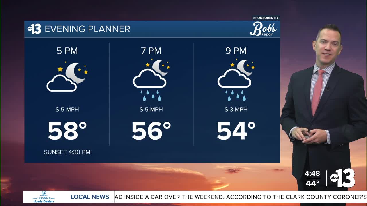 Rain chances linger at 40% Friday with highs in the upper 50s and a mostly cloudy sky.