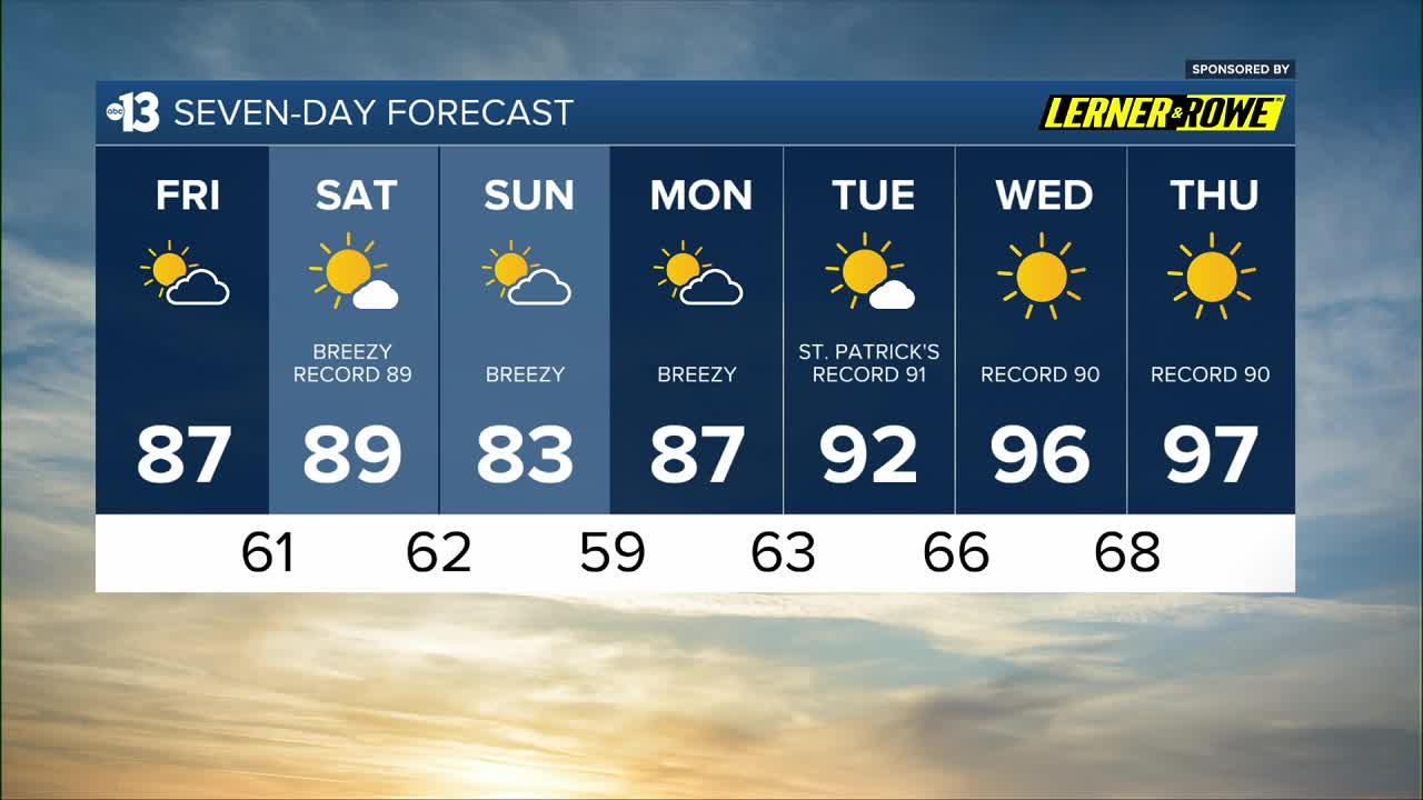 We're forecasting a record-tying 89° Saturday, 83° Sunday, and 87° Monday.