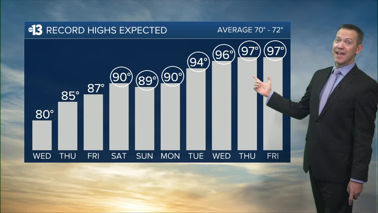 We're forecasting a record-setting 90° Saturday, 89° Sunday, 90° Monday, 94° Tuesday (St. Patrick's Day), 97° Wednesday and Thursday, and 94° next Friday. The all-time March record high is 93°, so we'll surpass that benchmark several times next week.