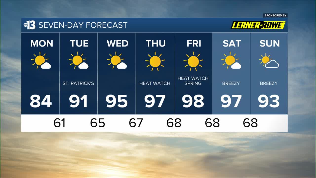 EVENING: Sunset is around 6:45 p.m. and we'll drop into the 70s as it gets dark. Partly cloudy conditions with 5-10 mph breezes.