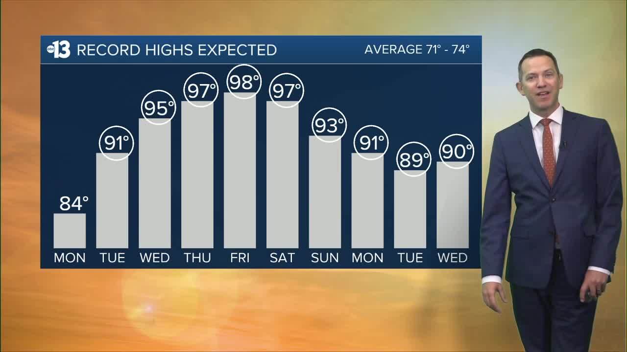 Records will be tied or broken tomorrow through early next week as an intense heat wave impacts Southern Nevada: Las Vegas sees 91° Tuesday (St. Patrick's Day), 95° Wednesday, 97° Thursday, 98° Friday, 97° Saturday, 93° Sunday, 91° next Monday, 89° next Tuesday, and 90° next Wednesday. The all-time March record is 93°, so we'll surpass that benchmark several times over. Spring doesn't even officially begin until 7:46 a.m. this Friday!