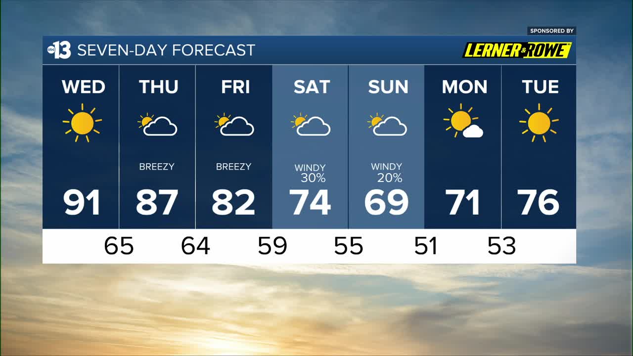 Highs in the mid 80s Thursday and low 80s Friday drop to the mid 70s Saturday, upper 60s Sunday, low 70s Monday, and mid 70s Tuesday.