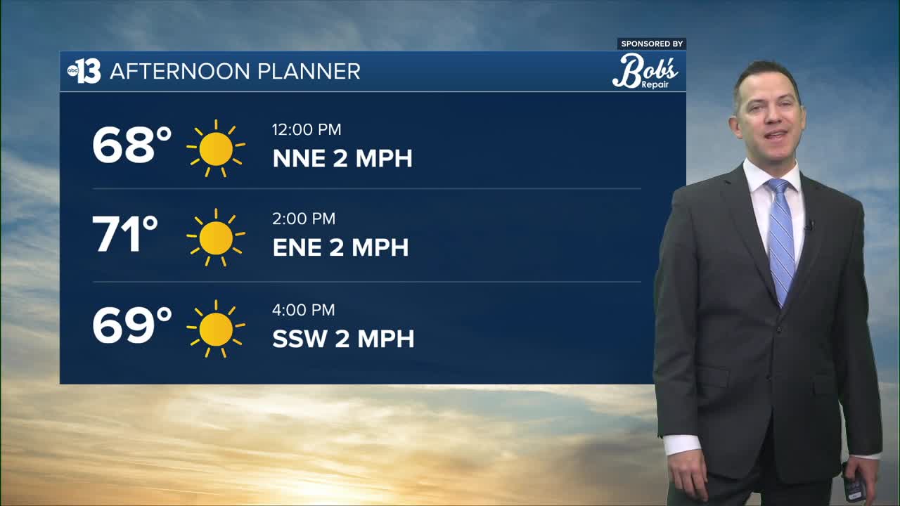 AFTERNOON: Sunny with highs in the low 70s, about 15° above-average.