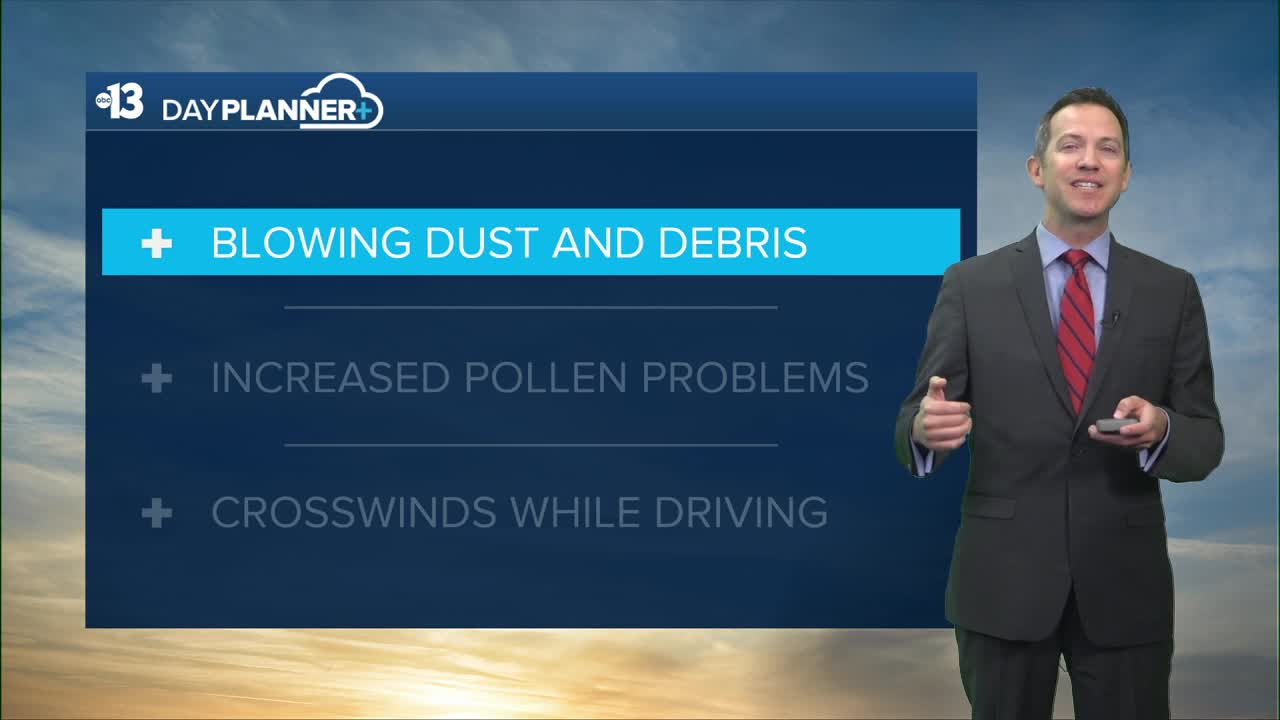 MORNING: Gusty northwest winds at 20-35 mph in Las Vegas cause blowing dust and debris. Peak winds of 45 mph in Centennial Hills, 40 mph in Summerlin and North Las Vegas, and 35 mph in Boulder City. Readings start in the mid 50s to low 60s with a mostly sunny sky.