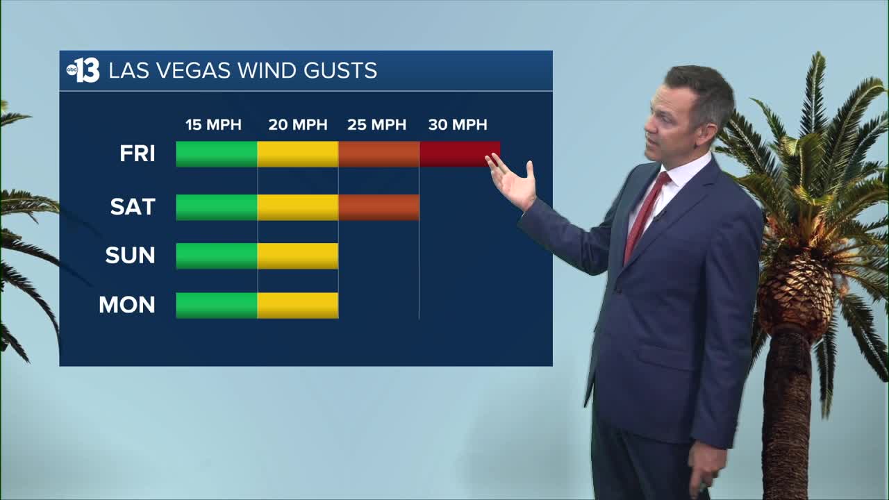 Las Vegas highs dip to the low 80s Tuesday, finally ending that streak of record highs that began near two weeks ago. Southwest winds hit 25-35 mph from midday through afternoon tomorrow, alongside a mostly cloudy sky. There's a 10% chance of a stray shower Tuesday, which climbs to 30% Tuesday night. Lows Tuesday night drop to the low 60s with some 10-20 mph southwest winds.