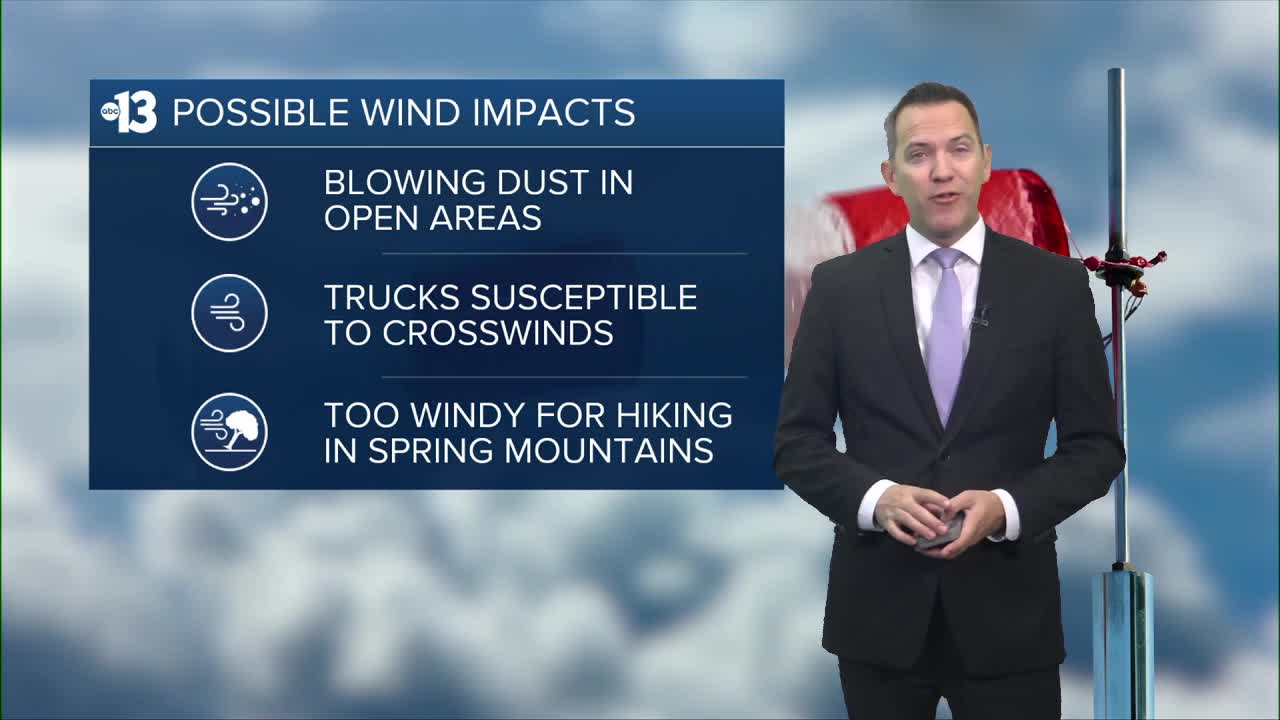 TONIGHT: Still breezy with 15-30 mph winds after sunset, as readings drop through the 70s and into the 60s by midnight. Late night lows in the upper 50s and low 60s around Las Vegas.