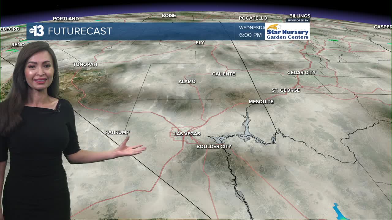 Mostly cloudy with lows the 50s tonight. Mostly sunny and warm on Thursday with highs in the low 80s. An area of low pressure moves in late Thursday and will bring rain to Southern Nevada by Friday morning. The rain chances will continue throughout the weekend with Saturday looking wetter than Sunday. The rain chances stay will us through early next week. Highs in the low 70s on Friday, then a drop in temperatures by Saturday with highs only in the mid 60s. Average high is around 67. We stay cool with highs in the low 60s and overnight lows in the 40s and 50s.