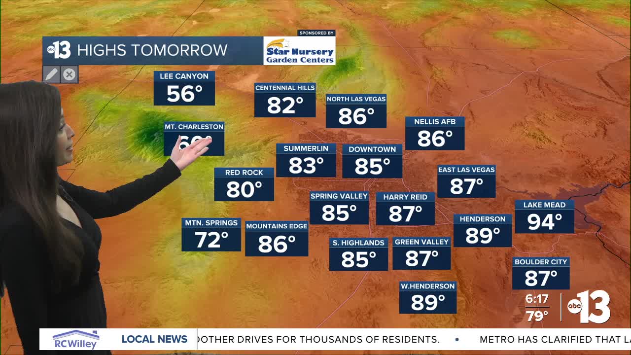 Mostly clear and cool tonight with lows in the 60s. The low pressure system that brought the showers and storms will move out of the region, leaving dry but slightly humid conditions on Monday. Mostly sunny and breezy on Tuesday as an area of low pressure moves into the West Coast. Less wind by Wednesday. Highs in the upper 80s to low 90s this week. Overnight lows in the upper 60s to low 70s.