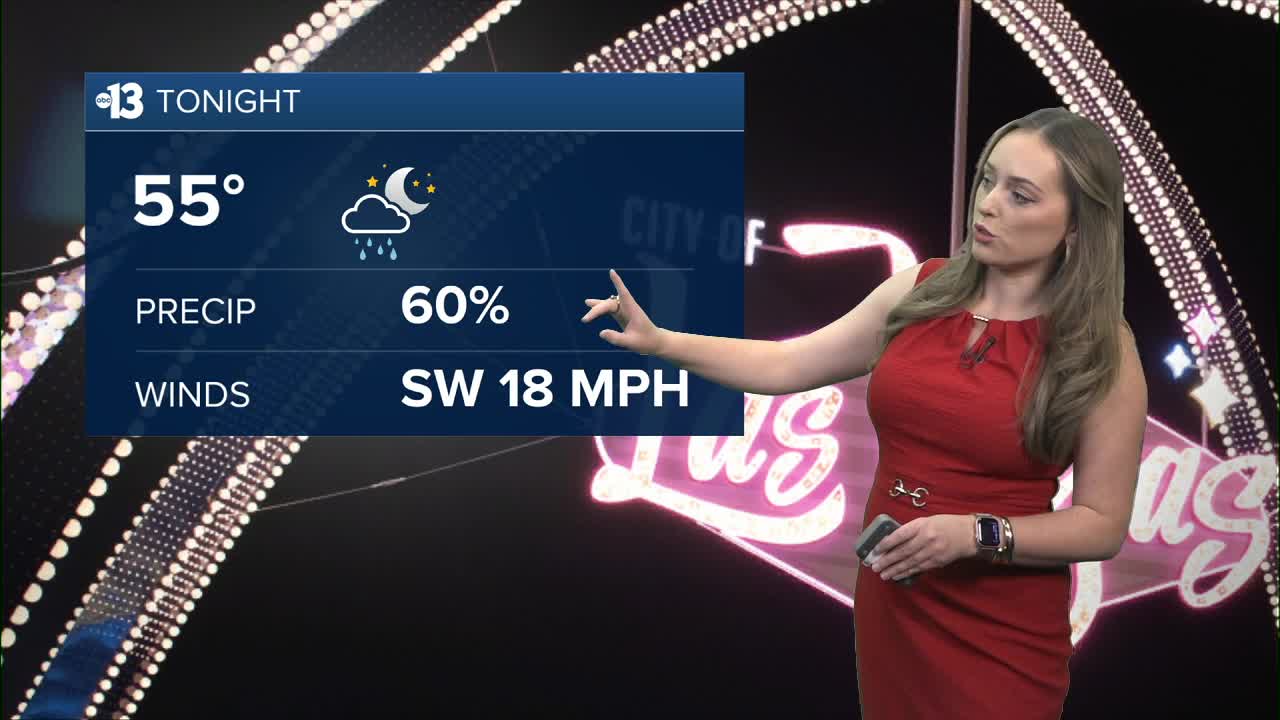 Overnight, there is a 60% chance of showers in the valley. Shower potential increases around 7PM, but we've already seen some rain towards the north of the metro area in the Sheep Range. Our low temperature tonight is 55 degrees.