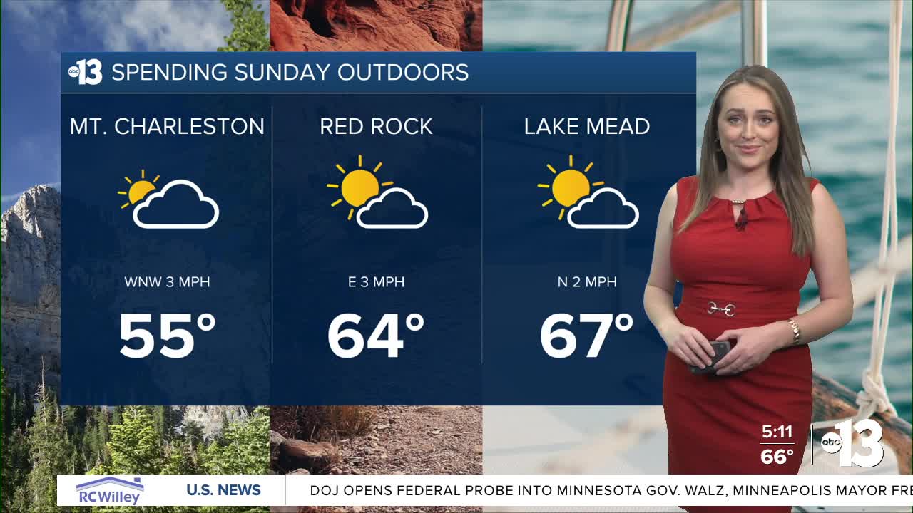 On Sunday, Las Vegas will see a high temp of 66 which is six degrees warmer than average. Light, and variable wind speeds in the valley with occasional strong gusts towards Laughlin. Some high cloud cover will drift in for the evening and overnight hours towards Southern Nevada.