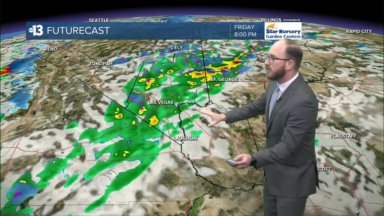 A calm start to the Friday after Christmas in Southern Nevada will turn into an active afternoon and evening, with light to moderate rain showers expected in the Las Vegas valley, and moderate to heavy snowfall likely through the Spring Mountains.