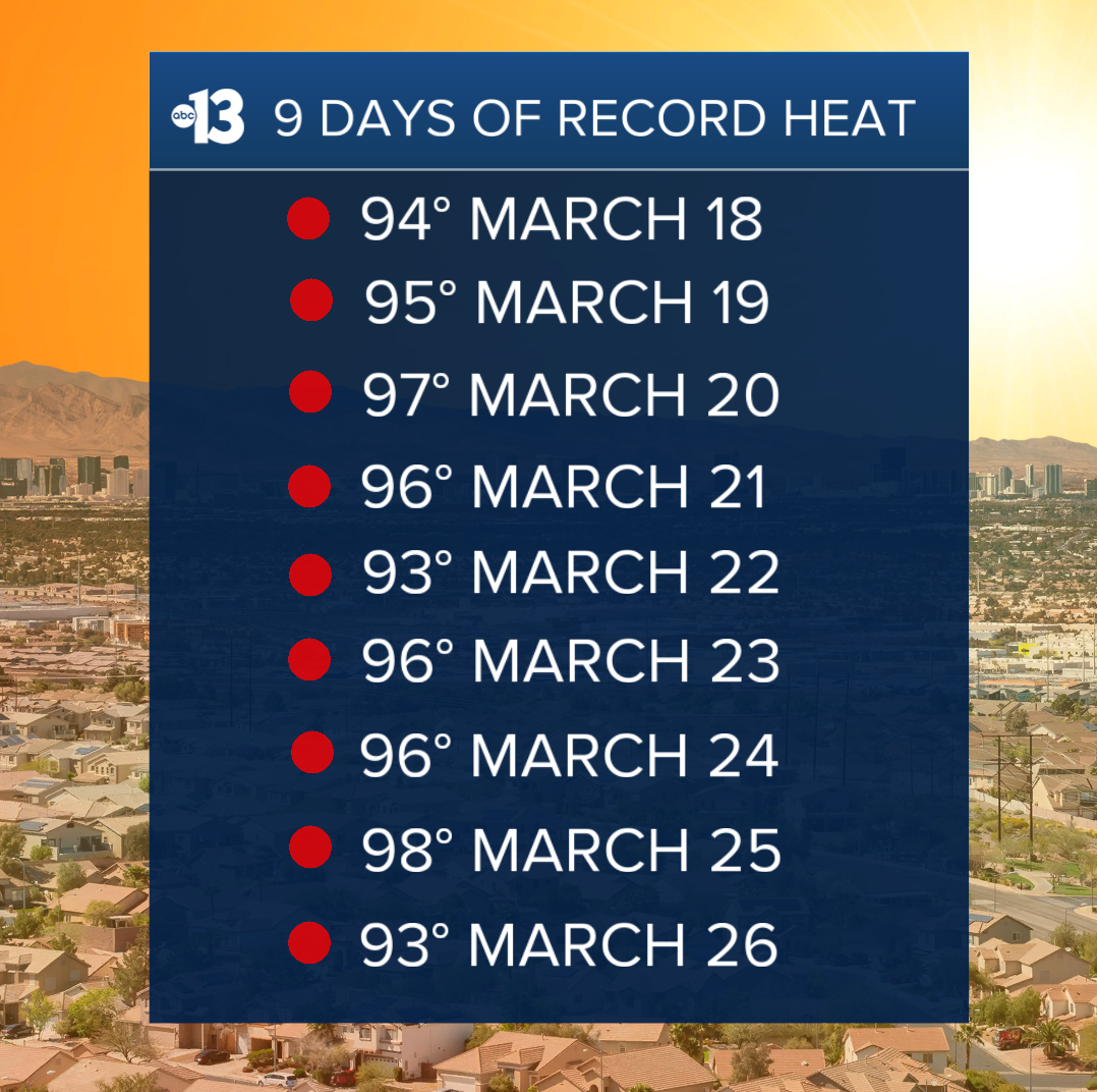 Harry Reid Airport reached 93°, tying the record high. Today is the 9th straight day of record heat in Las Vegas.